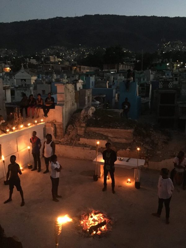 Performance présentée au cimetière de Port-au-Prince à l’occasion de la Ghetto Biennale 2017 (Port-au-Prince, Haïti). Adaptation libre en créole haïtien de la pièce de théâtre M. Toussaint d’Edouard Glissant (durée : 1h)